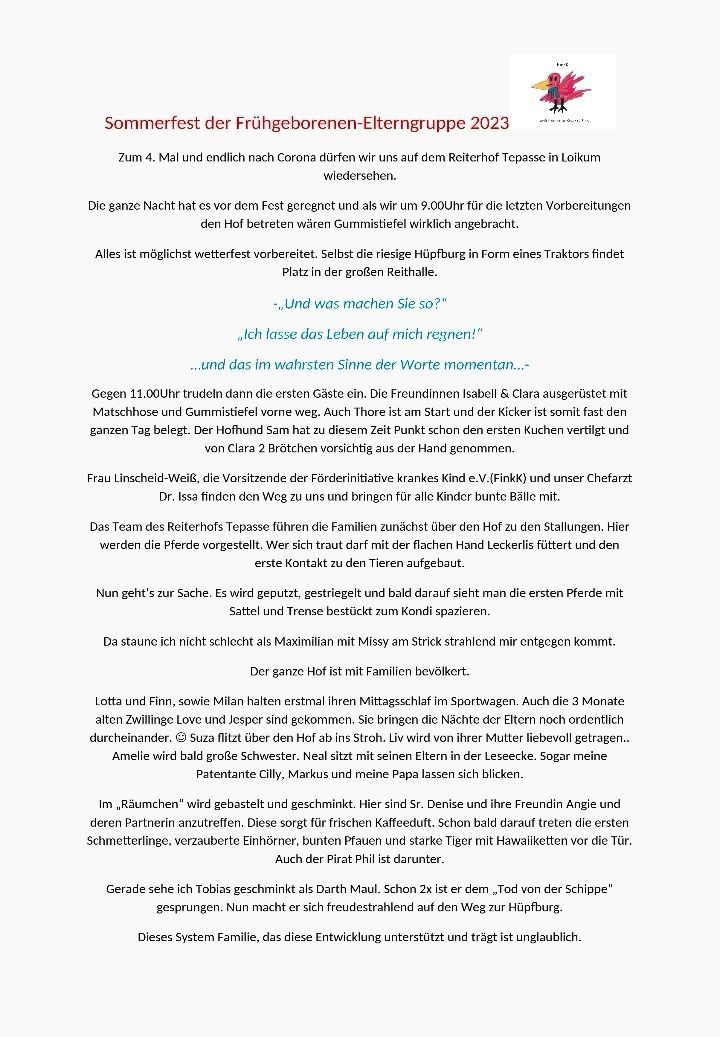 Frühgeborenen-Elterngruppeunter fachlicher Begleitung von Kinderkrankenschwestern, mit dem Ziel, einen regelmäßigen Austausch zwischen Familien mit frühgeborenen Kindern im Rahmen einer Spielgruppe bis zum 3. Lebensjahr sicherzustellen